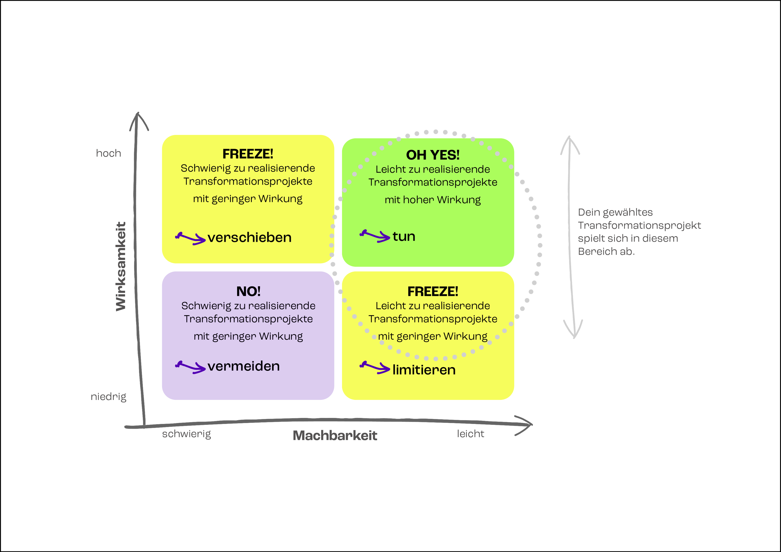 Die Machbarkeitsmatrix (Impact-Effort-Matrix) hilft Dir, unterschiedliche Projektideen systematisch zu bewerten: Was hat hohe Wirkung – und ist zugleich realistisch umzusetzen? Sie schafft Klarheit über Prioritäten, macht Quick Wins sichtbar und hilft Dir, Fokus und Energie gezielt einzusetzen, anstatt Dich zu verzetteln.